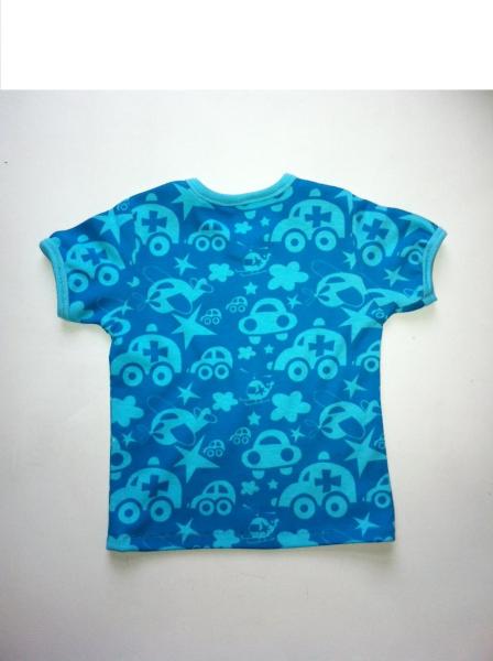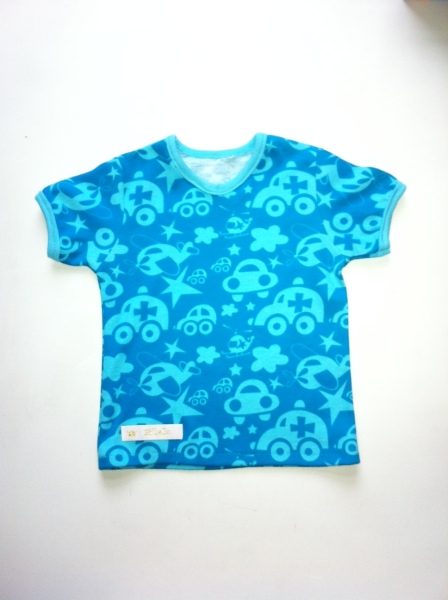 Schönes Kurzarmshirt aus türkisem Interlockjersey mit eingewebten Fahrzeugen und Hubschraubern, Ärmelkanten und Halsausschnitt mit helltürkisem Bündchen abgesetzt.