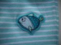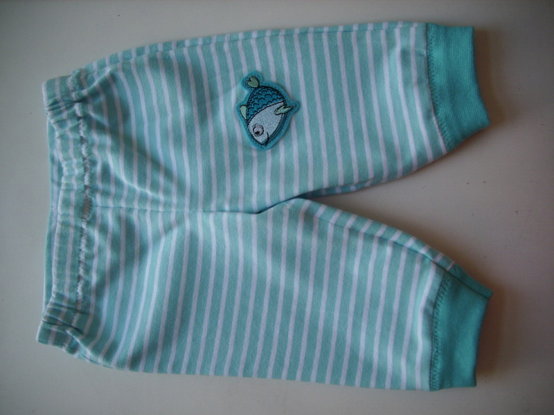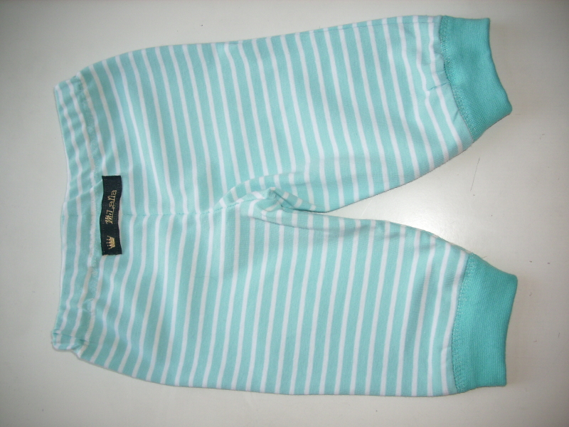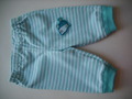 Leichte Baumwollhose aus gestreiftem Jerseystoff, Taillenbund mit Gummizug, Beinabschlüsse mit weissen Bündchen, Fischaufnäher auf dem linken Knie.