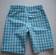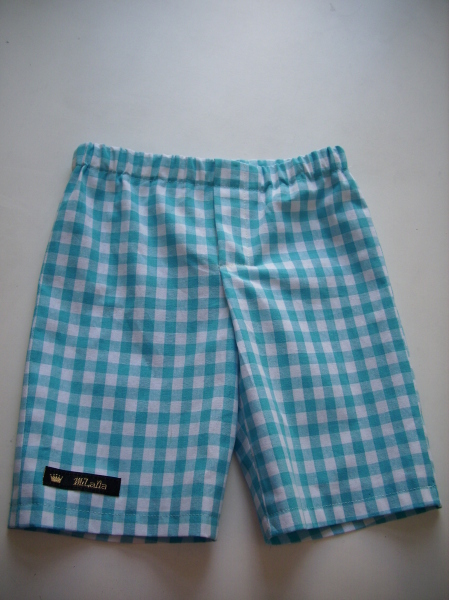 Leichte Sommerbermuda aus türkis-weissem Vichykarostoff, Taillenbund mit Gummizug, aufgesetze Tasche auf der Rückseite.