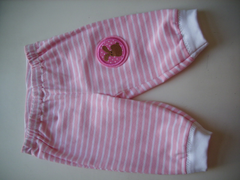Leichte Baumwollhose aus gestreiftem Jerseystoff, Taillenbund mit Gummizug, Beinabschlüsse mit weissen Bündchen, Hasenaufnäher auf dem linken Knie.